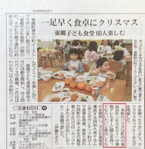 中日新聞に子ども食堂が掲載されました 投稿日: 2024年12月22日2025年1月10日 投稿者: komekofoods 12月21日に、東郷町いこまい館で開催された 東郷子ども食堂、クリスマス会の様子が 中日新聞で紹介されました。 昨日報告しました東郷子ども食堂での米粉パスタ 本日の中日新聞でも紹介いただきました。 乳と大豆以外の特定アレルゲンのないミートソースと 米粉麺を使った米粉パスタ。 子ども達からも大好評で、本当に嬉しかったです。 小麦を含まない冷凍米粉パスタ【おいで食べ米!】と 白米麺、玄米麺は、オンラインショップ もしくは、東郷町の喫茶店キャトルで販売しています。