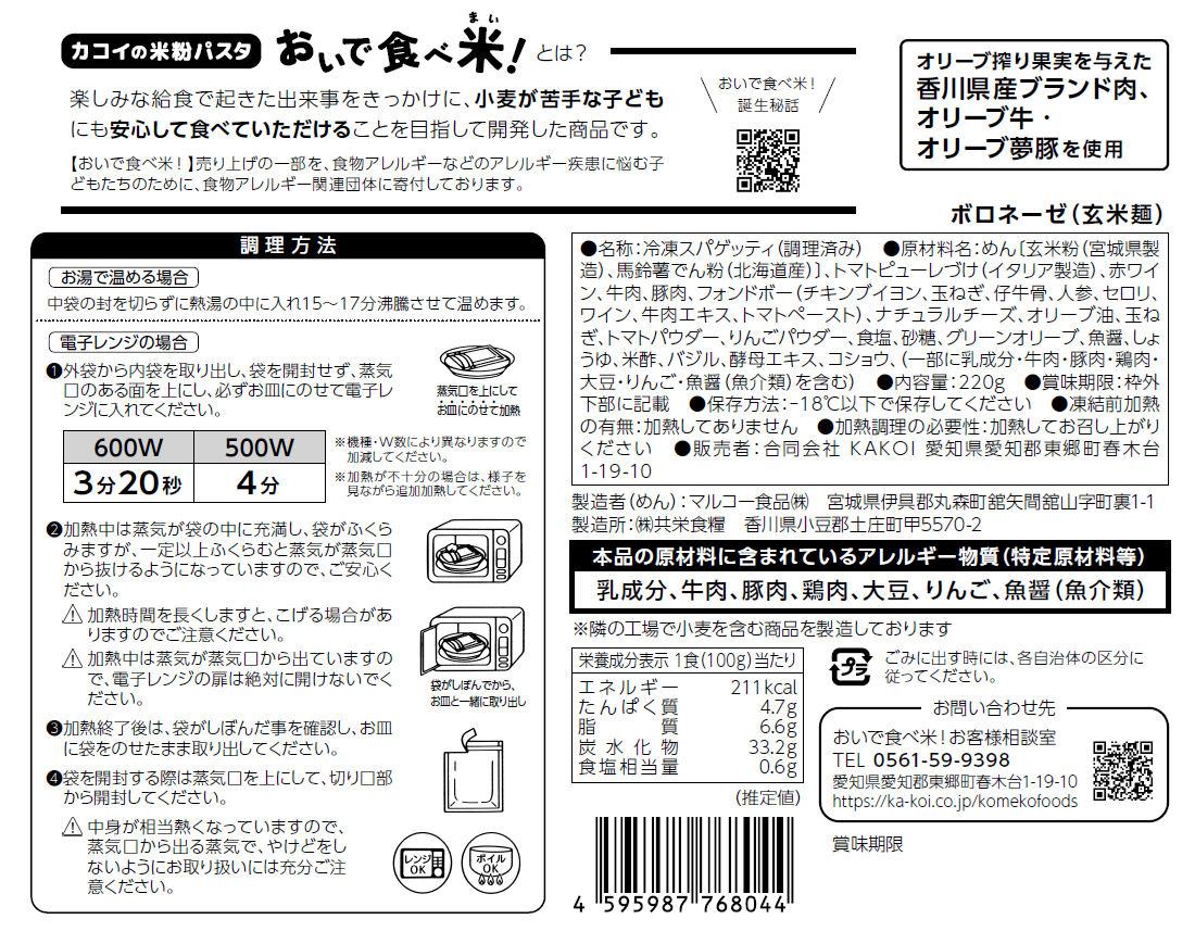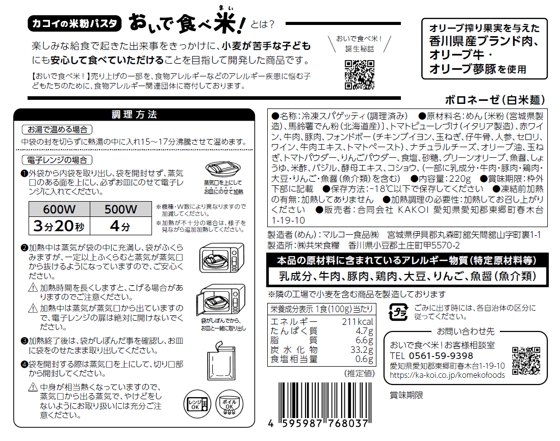 ボロネーゼ:乳成分、牛肉、豚肉、鶏肉、大豆、りんご、魚醤(魚介類)